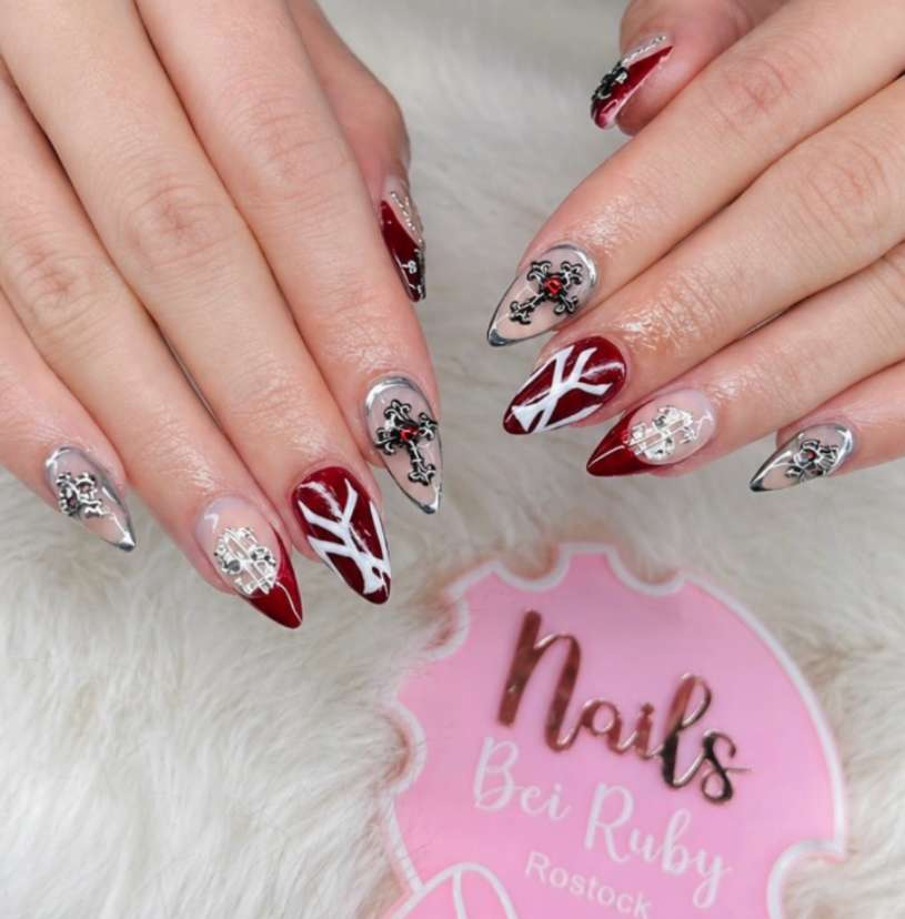 Dieses Nageldesign ist kein leiser Begleiter – es ist ein visuelles Statement. Tiefes, intensives Dunkelrot verschmilzt mit kühlen Silbernuancen, während kunstvolle Kreuzmotive und transparente Elemente eine geheimnisvolle, fast mystische Ausstrahlung erzeugen. Es ist ein Look, der sofort Aufmerksamkeit auf sich zieht und gleichzeitig eine außergewöhnliche Eleganz ausstrahlt.