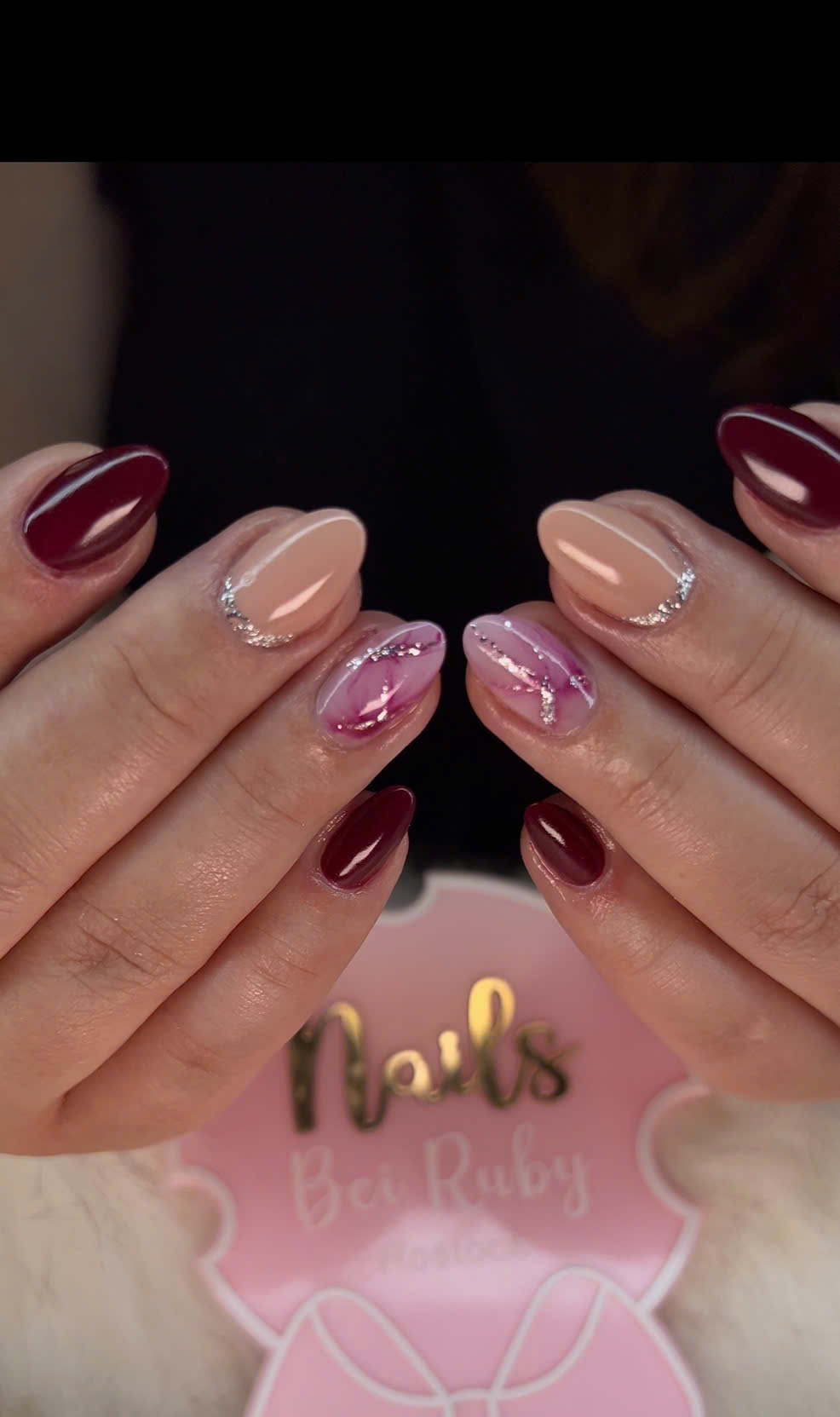 Dieses Nageldesign vereint klassische Eleganz mit moderner Kreativität. Die Mischung aus Bordeaux, Nude, Silber und Rosé macht es zum idealen Look für 2025 – vielseitig, stilvoll und einzigartig.