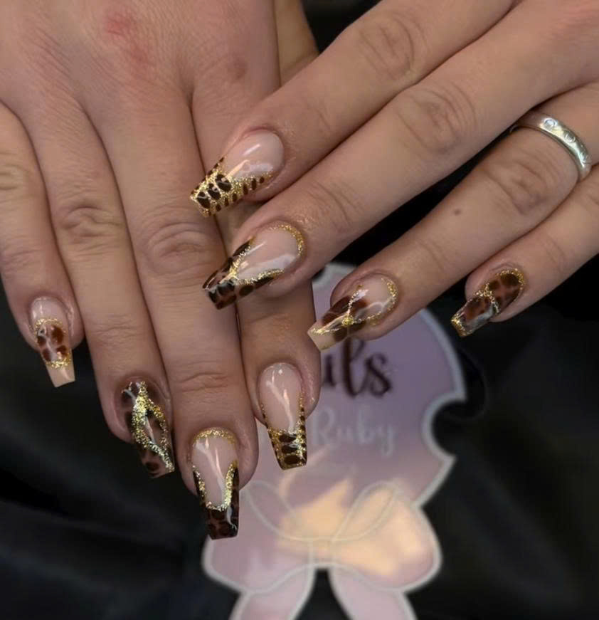 Die Kombination aus warmem Braun, zartem Nude und goldenem Schimmer wirkt luxuriös, ohne aufdringlich zu sein – genau das macht „Golden Leopard Glam“ so besonders.