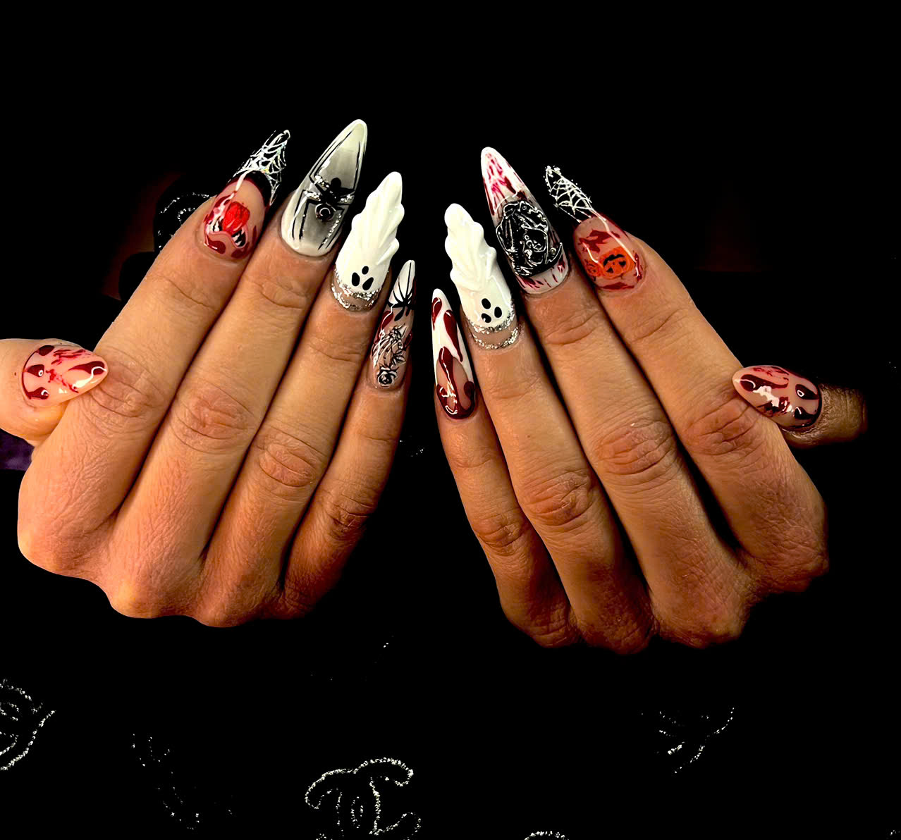 Bei diesem Halloween-Look wurde mit mehrschichtigen Gel- und Airbrush-Techniken gearbeitet, kombiniert mit feinen Linien, Glanzversiegelung und händisch modellierten 3D-Details.