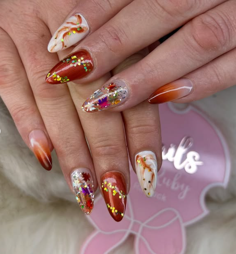Viele Nail Artists lassen sich direkt von der Natur inspirieren. Das Herbstdesign von Ruby Nails Studio Berlin entstand nach einem Spaziergang im Tiergarten – die warmen Töne der Blätter, das Glitzern der Sonne auf nassem Asphalt, das Zusammenspiel von Licht und Schatten.