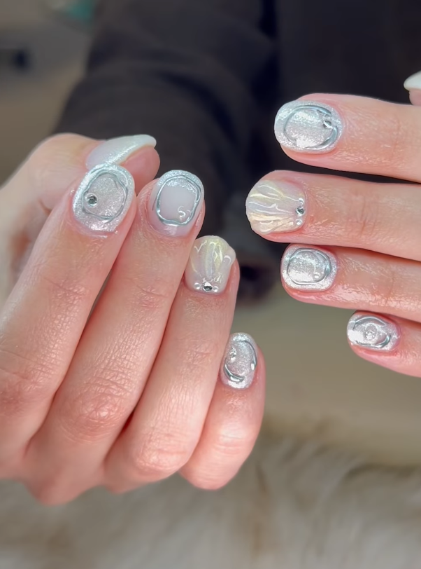 Silberne Nägel feiern 2026 ihr großes Comeback – moderner, minimalistischer und futuristischer als je zuvor. Das hier gezeigte Nageldesign kombiniert hochglänzenden Chrome-Effekt mit zarten Nude-Elementen und plastischen 3D-Details. Das Ergebnis: ein avantgardistischer Look, der Eleganz und High-Fashion perfekt vereint.