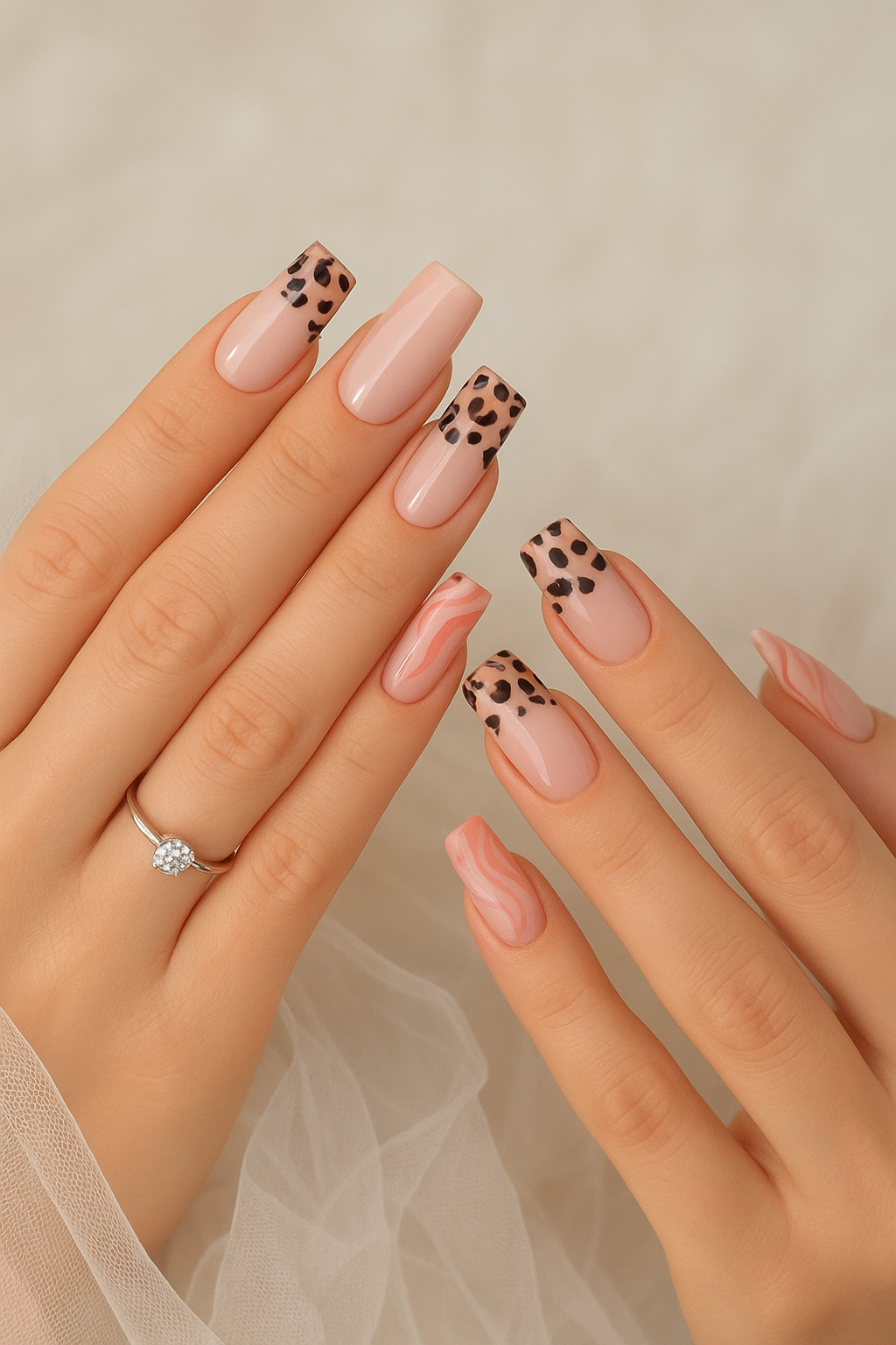 Die in den Fotos dargestellten Nägel kombinieren eine zarte Nude-Basis mit auffälligen French-Spitzen, die durch Leopard-Muster und rosa Waves veredelt werden.