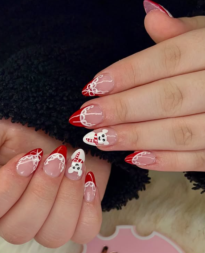 Dieses Nageldesign ist der perfekte Beweis dafür, dass Weihnachtsnägel verspielt und gleichzeitig elegant sein können. Die Kombination aus rotem French, zarten weißen Linien und einem liebevoll gestalteten Santa Claus macht diesen Look zu einem echten Highlight der Weihnachtssaison 2025.