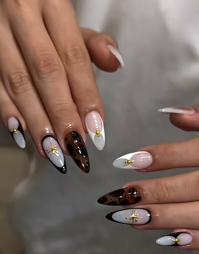 Nageldesigns sind längst mehr als nur ein kleiner Beauty-Akzent – sie sind Ausdruck der Persönlichkeit, ein modisches Statement und oft das erste Detail, das anderen ins Auge fällt. Das hier gezeigte Nageldesign ist ein wunderschönes Beispiel für eine moderne Mischung aus zarter Eleganz, niedlichen Akzenten und einem Hauch Luxus. Die Kombination aus Weiß, Schwarz, Nude, einem sanften Tortoise-Shell-Muster und goldenen Details schafft ein Design, das sowohl chic als auch einzigartig ist.