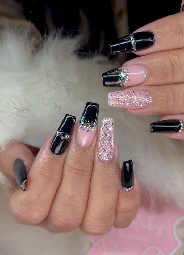 Das hier gezeigte Nageldesign kombiniert tiefes, spiegelndes Schwarz mit zarten Nude-Elementen und glamourösem Glitzer – ein perfekter Mix aus Mystik und Luxus. Dieses Design ist ideal für Frauen, die auffallen möchten, ohne dabei überladen zu wirken.